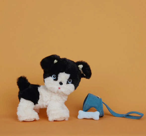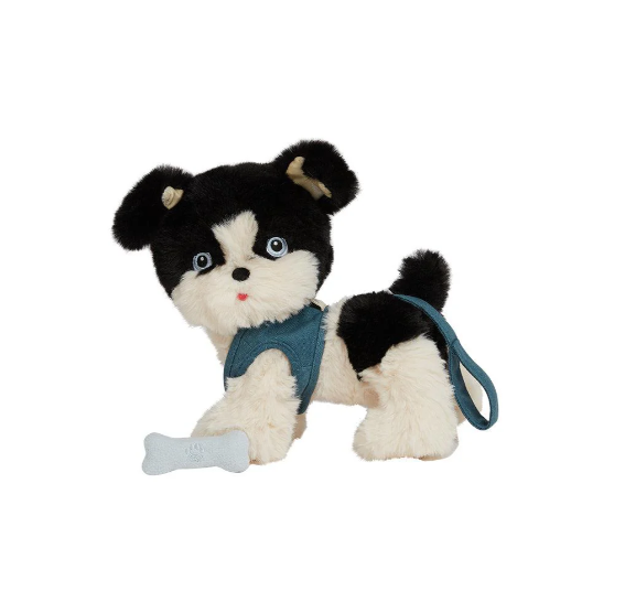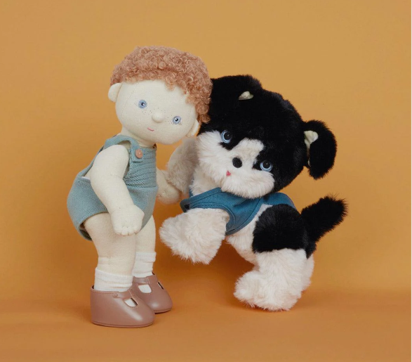 The Olli Ella Dinkum Dog Lucky is made from soft recycled plush fabric with velvety ears to snuggle, Lucky is fully poseable and can stand, lay down, and even sit! Lucky's head moves and is embroidered with the sweetest doggy face, there's a rainbow surprise on one of Lucky's little paws.
